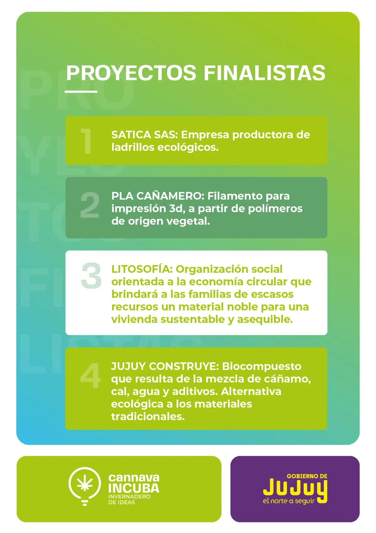 Están en la etapa de evaluación final: SATICA SAS: Empresa productora de ladrillos ecológicos, PLA CAÑAMERO: filamento para impresión 3d, a partir de polímeros de origen vegetal. LITOSOFÍA: Organización social orientada a la economía circular que brindará a las familias de escasos recursos un material noble para una vivienda sustentable y asequible. JUJUY CONSTRUYE: Biocompuesto que resulta de la mezcla de cáñamo, cal, agua y aditivos. Alternativa ecológica a los materiales tradicionales. MODULOS DE PROCESAMIENTO: Manteca cannábica, aceite macerado, productos de panadería y pastelería, productos de cosmética, cuidado capilar y facial. ECONCRETO: material estructural para Bioconstrucción, relleno de estructuras. PROCER: Biobriquetas, ladrillos, fieltros, hilados y hongos. – CAÑATEX: Fibra de Cáñamo. CAÑAMO: Fibra de cáñamo. COMPOST y FIBRA: abono vegetal y filamento para la industria textil.