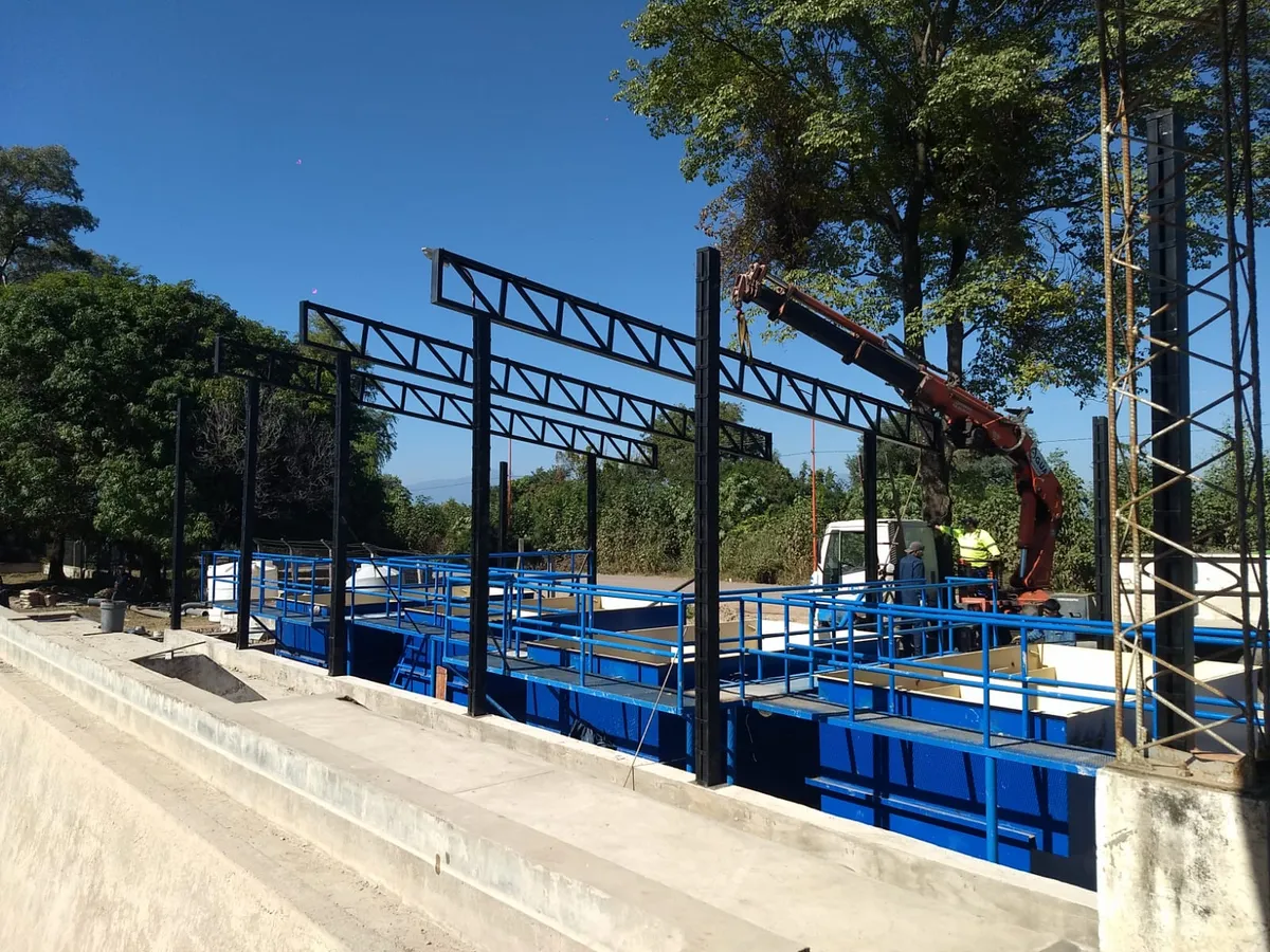 Actualmente, operarios efectúan el montaje final de la cubierta metálica de los filtros rápidos ya colocados, una canaleta en cada decantador nuevo de agua cruda e intervenciones claves para mejoras en el sistema de cloración.