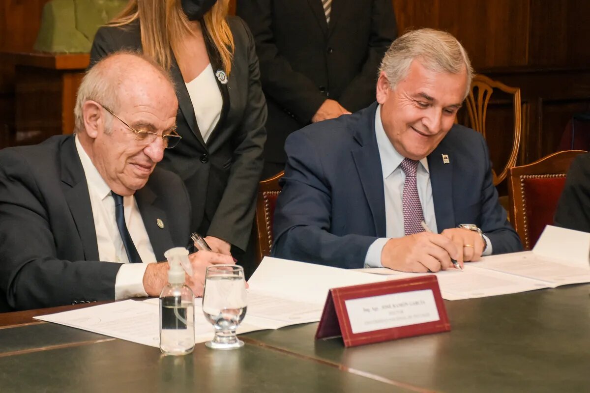 El gobernador Gerardo Morales y el rector de la Universidad Nacional de Tucumán, José García firmaron un Convenio de Cooperación y Asistencia Técnica para el desarrollo de temas estratégicos para como electromovilidad, la transición energética en litio, los bioplasticos, la eficiencia energética, la agroindustria y el cannabis medicinal.