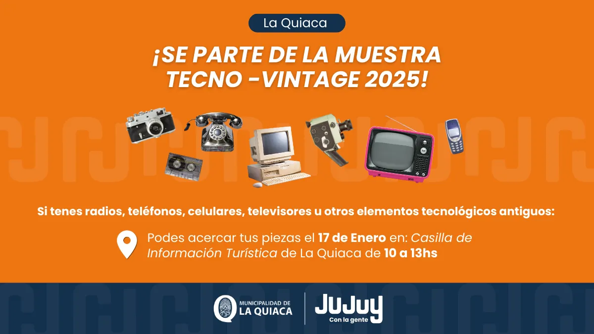 En el marco del Proyecto Museo Tecno-Vintage, la Dirección de Promoción y Divulgación Científica y Tecnológica invita a la comunidad a participar en una jornada especial de recolección de objetos tecnológicos históricos que se realizará el próximo 17 de enero, de 10 a 13 horas, en la Casilla de Información Turística de La Quiaca.